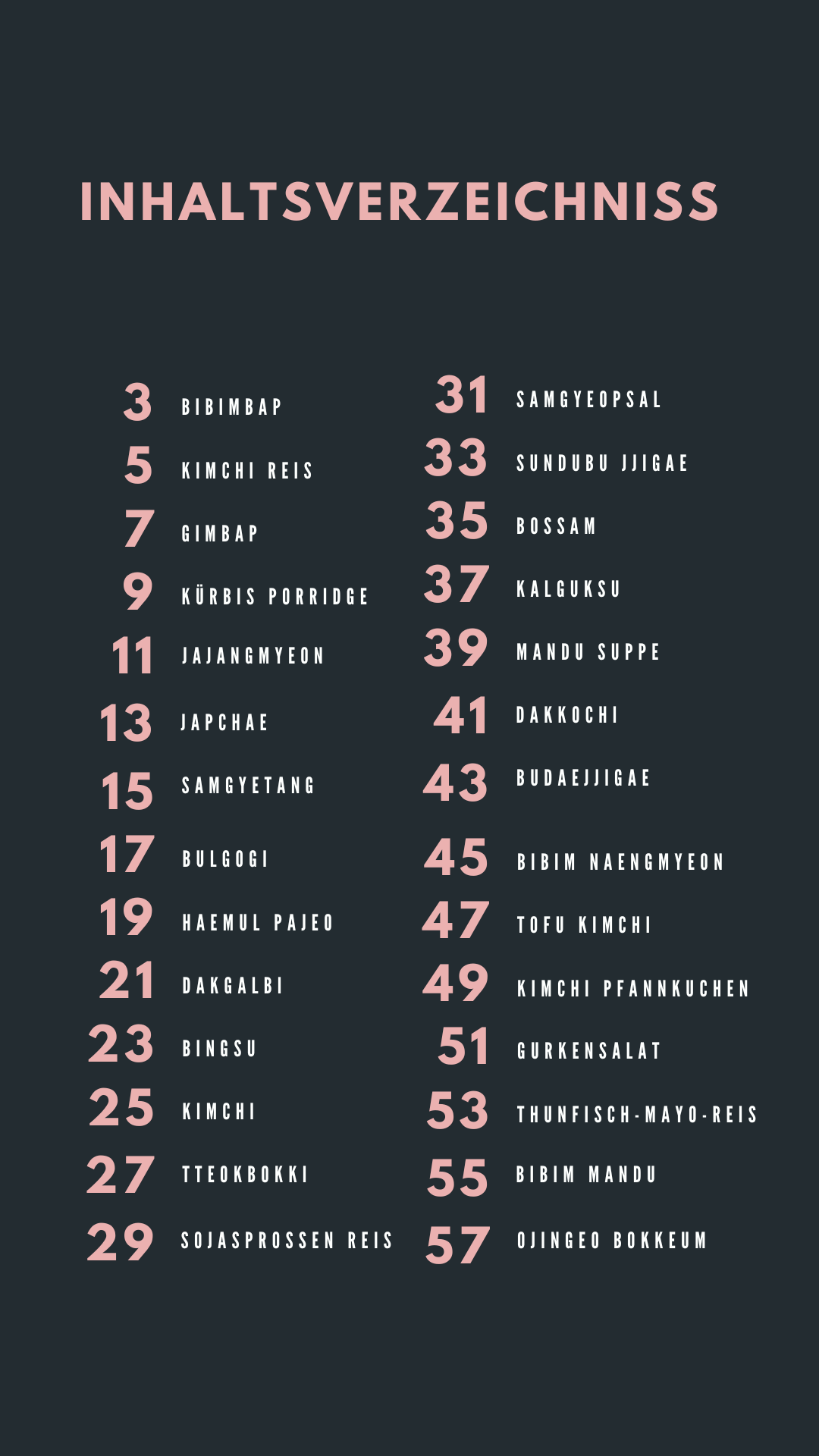 Dieses Koreanisch Kochbuch enthält 42 klassische und moderne Rezepte. Die Rezepte haben wir alle selbst ausprobiert und für sehr gut empfunden. Bei den Zutaten wurde außerdem darauf geachtet, dass diese in deutschen Supermärkten erhältlich sind. Unter anderem, findest du im Kochbuch Rezepte für Bulgogi, Japchae, Kimchi, Kimbap und Bibimbap. Du wirst also mit Sicherheit ein Rezept finden, das auch dich begeistern wird.